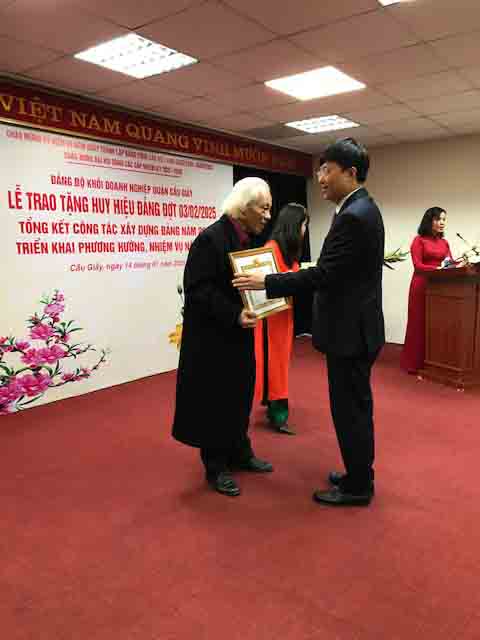 Trực tiếp lên sân khấu trao huy hiệu cho ông, đảng viên đầu tiên và duy nhất ở đợt này đạt mốc 45 năm Tuổi Đảng trong danh sách hơn hai mươi đảng viên nhận huy hiệu từ 30 năm Tuổi Đảng trở lên, có hai quan chức của Quận ủy Cầu Giấy.